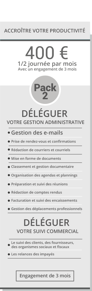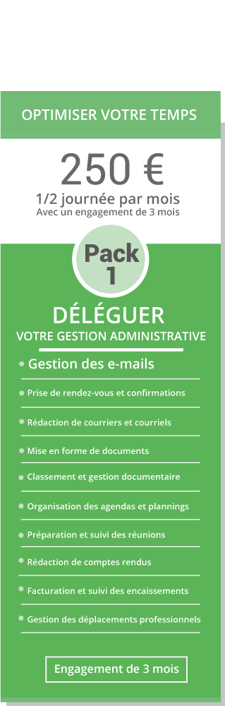 Vous qui êtes entrepreneurs multitâches, sans possibilité de recruter à plein temps ou à mi-temps, j’ai la solution pour vous accompagner. Que ce soit en présentiel ou à distance, j’assiste les entreprises dans des domaines essentiels comme l’administration, la gestion commerciale, la communication, le marketing et bien d’autres. Chaque mission est adaptée et personnalisée, en identifiant clairement dans le cahier des charges les tâches à déléguer, leur volume et récurrence, ainsi que leur degré d’importance